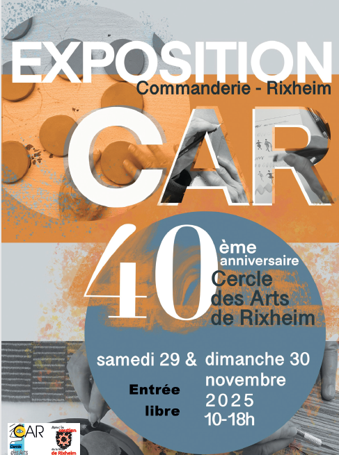Les membres du Cercle des Arts de Rixheim ont le plaisir de vous inviter à fêter leur 40ème anniversaire samedi 29 et dimanche 30 novembre, de 10h à 18h, dans les salons de la Commanderie (Hôtel de Ville).