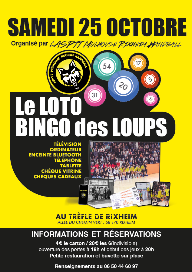 L’ASPTT Mulhouse Rixheim Handball organise son loto bingo des loups samedi 25 octobre à la Salle du Trèfle.
