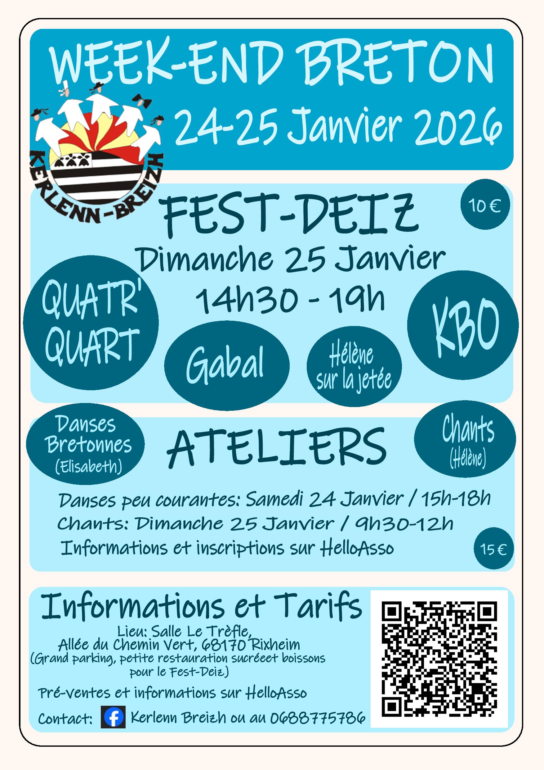 La Bretagne s’invite Ă Rixheim ! Retrouvez le week-end breton “Fest-Deiz” proposĂ© par Kerlenn Breizh samedi 24 et dimanche 25 janvier.